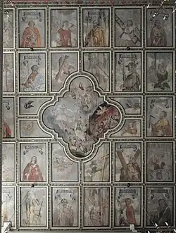 Die Felderdecke zeigt religiöse Motive: Im Zentrum befindet sich eine Darstellung des Jüngsten Gerichts, die acht angeschnittenen Felder zeigen Engel mit Werkzeugen der Folterung Christi, 13 rechteckige Tafeln sind mit den 13 Aposteln bemalt und die restlichen neun Felder zeigen Engel mit Symbolen der Passion Christi. Über der Orgelempore finden sich sechs weitere Felder, die seitlich je zwei Engelsköpfe zeigen und mittig links das Dresdner Stadtwappen sowie rechts das sächsische Kurwappen.