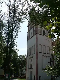 Der Grundbaustoff der Kirche waren Mauerziegel, teilweise auf Feldstein gesetzt.[3] Die Außenwände wurden verputzt. Der Turm hat eine gotische Form bis zum dritten Stock, die Giebel wurden im Neorenaissancestil hinzugefügt. Er steht auf quadratischem Grundriss, ist mit einem Zeltdach bedeckt, und an den beiden Giebeln befinden sich Uhren.