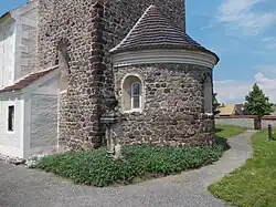 Der Zugang zur Kirche erfolgt durch einen Anbau mit Walmdach auf der Westseite, der auch die Treppe zur Empore enthält.
