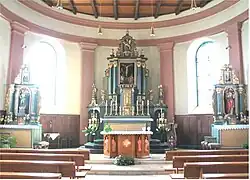 Der Hauptaltar mit der Darstellung der Schmerzhaften Muttergottes und die beiden Seitenaltäre (Maria, Herz Jesu) stammen aus der Barockzeit. Farbige Fenster wurden aus Kostengründen erst 1862 eingesetzt.