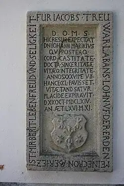 An der Kirche findet sich ein Epitaph aus dem Jahre 1664 für Pfarrer (?) Johann Marikius. Auf dem Rand steht geschrieben: