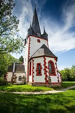 Die Kirche ist ein verputzter Bruchsteinbau mit eingezogenem Chor und dreiseitigem Ostschluss, dessen Ecken und Gewände mit Porphyrgliederungen versehen sind. Der Turm mit Spitzhelm ist von vier Dachtürmchen umgeben, an der Chorsüdseite ist die Sakristei angebaut. Das Schiff ist mit Strebepfeilern und hohen Spitzbogenfenstern über zwei kleinen gekuppelten Vorhangbogenfenstern an der Südseite versehen. Die Vorhalle an der Südseite ist mit einem Spitzbogenportal erschlossen; an der Westseite ist ein halbrunder Treppenturm mit Vorhangbogenfenstern angebaut.