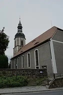 Die klassizistische Saalkirche wurde nach Abbruch einer bereits im 14. Jahrhundert erwähnten Kirche im Jahr 1780 unter Verwendung älterer Bauteile erbaut. Eine Erneuerung des Turms erfolgte in den Jahren 1880/81; in den Jahren 1929–1939 wurden die Emporen hinter dem Altar abgebrochen. Das Bauwerk ist ein verputzter Bruchsteinbau mit geradem Ostschluss und wird durch ein Satteldach geschlossen. An der Ostseite liegt der von einer zweiläufigen Treppe gerahmte Eingang; darüber ist eine Inschrifttafel mit der Jahreszahl 1780 angebracht. Der Turm im Westen ist auf quadratischem Grundriss erbaut, das Glockengeschoss ist oktogonal gebildet und wird von einer geschweiften Haube mit Laterne abgeschlossen.