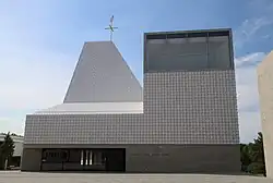 Die „Sprungschanze Gottes“, wie die Kirche aufgrund ihrer auffälligen Form genannt wird, ist einem Kristall nachgeahmt.[8] Die Fassade ist mit 15.000 weißen, dreidimensionalen Kacheln bedeckt, die das Bauwerk in der Sonne strahlen lassen. Auf der 34 Meter hohen Spitze ist ein goldenes Kreuz mit Wetterhahn angebracht.[1][4] Das Gebäude wird durch ein innen nicht sichtbares Stahlkreuz getragen. Eine Treppe führt zu einem Gang zwischen den beiden Hüllen der Kirche und weiter bis zu einem Balkon auf dem Dach.[6]