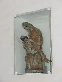 Die Figurengruppe der Pietà ist aus Lindenholz geschnitzt, 110 Zentimeter hoch und 50 Zentimeter breit. Erwin Poeschel datiert sie in die Zeit um 1360.