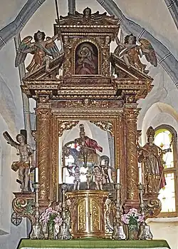 Der frühbarocke Hochaltar ist ein zweisäuliger Ädikula-Altar mit einem Reiterstandbild des hl. Martin als Zentralfigur. Assistenzfiguren sind links der hl. Sebastian, rechts ein hl. Bischof. Das Aufsatzbild im gesprengten Giebel zeigt Maria mit dem Jesuskind.