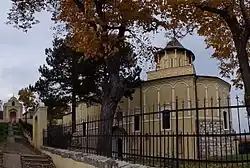 Da das Kirchengebäude an einem Hang erbaut wurde, ist das Gotteshaus sowohl von der unteren (östlichen) als auch von der oberen (westlichen) Seite aus zu erreichen. An der Westseite steht an der Straße ein großes Eingangsportal, das im oberen Teil, mit einer Patronatsikone des Hl. Nikolaus geschmückt ist. Eine breite Treppe, die vom großen Eingangsportal runter den Zaun der nördlichen Seite des Kirchenhofs zu einem kleineren Eingangsportal hinunterführt, bietet den Zugang zur Kirche. Im umzäunten Kirchhof stehen neben der Kirche, der Kirchbrunnen, Sitzbänke und Bäume.