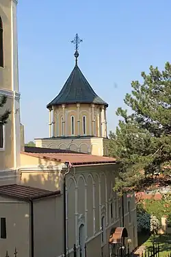 Das mit einem Halbkreisgewölbe überwölbte und einschiffige Kirchengebäude mit einem rechteckigen Grundriss, ist in seiner Grundkonzeption, in der Tradition der serbischen mittelalterlichen Kirchenarchitektur (Serbisch-byzantinischer Stil) kombiniert mit barocken Elementen, mit einer erweiternden außen und innen fünfseitigen Altar-Apsis in der Breite des Kirchenschiffs im Osten, einer über dem Mittelteil des Kirchenschiffs von vier freien Säulen getragene Kuppel und einem Narthex mitsamt einem nachträglich hinzugefügten hohen barocken Kirchturm, den eine mehrgeschoßige Zwiebelturmkappe krönt, im Westen, erbaut worden.