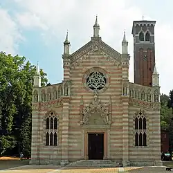 Die Kirche ist eine dreischiffige Basilika mit einem erhöhten Mittelschiff und einem Turm in der Art eines Campanile an der Seitenwand des Presbyteriums. Das Gebäude wurde in Ziegelstein-Bauweise mit Marmordetails nach Plänen von Pietro Bigaglio, Professor an der Akademie der bildenden Künste in Venedig, ausgeführt. Dabei wurden zahlreiche Spolien venezianischer Kirchen verwendet, deren Einbau von Bigaglio überwacht wurde, der während des Baus der Kirche mehrfach vor Ort war.