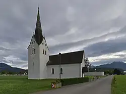 In der Höhe des Chors ist nördlich ein gedrungener, rechteckiger Turm angebaut, der an drei Seiten freisteht und einen braunen achteckigen Spitzhelm hat. Das Satteldach ist mit Biberschwanzdachziegeln eingedeckt. Der Bau selbst ist weitgehend weiß verputzt.