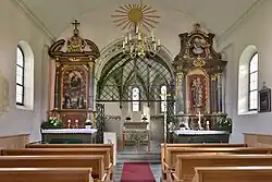Der Betraum hat ein Holz-Tonnengewölbe, während der Chorraum ein Netzrippengewölbe aufweist. Der Boden ist schachbrettartig mit hell- und dunkelgrauen, hochgestellten Fließen ausgelegt, wobei der Chorraum vom Betraum durch einen Chorbogen, zwei Stufen und ein massives Metallgitter abgegrenzt wird.