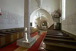 Den Innenraum prägt ein ungewöhnlicher Farbreichtum, der durch Kalkmalereien aus drei Epochen hervorgerufen wird: