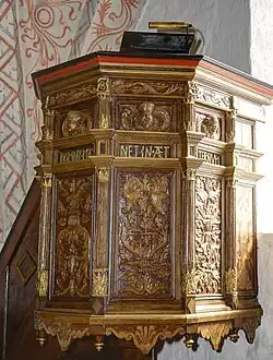 Die Kanzel aus dem Jahre 1584 hat eine Treppe aus späterer Zeit. In vier großen durch Säulen getrennten Feldern sind Laubwerk und Masken eingeschnitten. Gegen die Wand gibt es ein fünftes Feld ohne Schnitzereien, es ist nur bemalt. Der lateinische Text in den Feldern lautet: „VERBVM DOM(I)NI MANET IN ÆTERNVM“ (Das Wort des Herrn währet ewiglich). Um 100 Jahre falsch ist die am oberen Rand geschnitzte Jahreszahl 1684[1]. Der große in die Fensternische ragende Himmel deutet darauf hin, dass die Kanzel ursprünglich vor dem Chor gestanden hat, wozu es Beispiele auf Jütland gibt. Die Rosette im Himmel ersetzt die sonst übliche Taube als Sinnbild des Heiligen Geistes. Die Angaben 1857 auf dem Altar und 1858 (MDCCCLVIII) an der Kanzel weisen auf eine größere Restaurierung hin.[2]