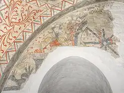 Im westlichen Gewölbe – vor dem Turm, der keine Malereien aufweist – wird die Zeit der Kirche dargestellt, mit ihren Heiligen, dem Alltagsleben, Himmel und Hölle: