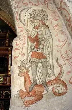 An der Triumphwand – der Mauer zwischen Schiff und Chor – ist an der Südseite ein Bild vom heiligen König Olav mit der Axt des Kriegers und dem Kelch der Kirche erhalten, der die gekrönte Midgardschlange des Heidentums mit Füßen tritt. Man hat das Bild stark restaurieren müssen, aber dessen Platzierung deutet an, dass er als Schutzpatron der Kirche hier einen Altar gehabt hat.