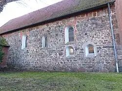 Bei der romanischen Saalkirche mit vorgestelltem Westturm stammen die aus Feldsteinen bestehenden Westteile der Kirche aus dem frühen 13. Jahrhundert. 1325 wird sie als Kirche des Hl. Dionysius erstmals urkundlich erwähnt.[1] Der aus Backsteinen bestehende Ostteil mit hohen Rundbogenfenstern wird auf das Ende des 13. Jahrhunderts datiert. In der Zeit oder etwas später wurden mehrere Fenster des Feldsteinschiffs mit Backstein vergrößert, das westliche der Nordseite mit angedeutetem Spitzbogen. Der 25 Meter hohe Turm ersetzt seit 1852 einen vorigen Turm. Am ehemaligen Südportal erkennt man Wetzrillen, deren Funktion und Bedeutung hier und andernorts immer noch nicht abschließend geklärt sind.