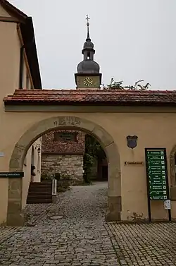 Die Anlage wird heute durch das ans Rathaus angebaute Portal betreten. Es entstand im Jahr 1596 und trägt im Scheitelstein die Inschrift:[3]„HANS DIE/ TERICH/ HANS BEL/ TZ DER/ ZEIT BÜR/ GÄRMEISTER“. Daneben sind die Jahreszahlen 1596 und 1976, das Jahr einer Renovierung, sowie ein Steinmetzzeichen angebracht. Das Rathaus ist zweigeschossig und wird im Obergeschoss von neuem Fachwerk gegliedert.
