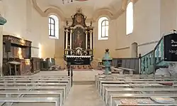 Der einfache strebepfeilergestützte Bau hat einen polygonal geschlossenen fünfseitigen Chor, nur wenig schmaler als der Saalbreite. Der Saal ist flach gedeckt und mit Stuckmedaillons und Doppelgurten, die auf klassizistischen Pilastern ruhen, reich gegliedert. Auf der steinernen Westempore, die durch Seitenkanzeln erweitert ist, steht die Orgel[1] von 1856. Die Orgelempore der nördlichen Glater, die Kanzel und der Taufstein sind malachitgrün marmoriert. Im Chor steht der reich gefasste Säulenaltar von Daniel Petersberger aus Mediaș. Das Mittelbild ist von korinthischen Säulen flankiert, darunter befindet sich eine Sakramentsnische. Über dem Architrav befindet sich eine Darstellung des auferstandenen Christus.