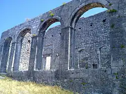 Später wurde im Süden eine Vorhallen angebaut, die aus einem Eingangstor und drei Arkadenbögen besteht. Dabei wurden auch Fenster in die Südwand, die als einzige noch erhalten ist, eingebaut.[1][2] Die Fenster haben eine Breite von 1,25 Metern und zwei Arkaden eine Breite von 1,34 Metern.