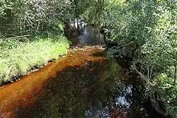 Die begradigte Kirnach bei Ebenhofen, im Hintergrund der Einlauf des Kirnachkraftwerks | ||