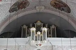 Die Orgel des Klagenfurter Doms befindet sich auf der zweiten Empore. Sie wurde im Jahr 1986 von der Schweizer Werkstatt Mathis Orgelbau errichtet, besitzt 45 Register auf drei Manualen und Pedal.[14] Das Gehäuse ist in barockem Stil gehalten und besteht aus Hauptwerk, flankierendem Türmen und dem Rückpositiv auf der Emporenbrüstung. Das Instrument wurde im Jahr 2008 einer Ausreinigung unterzogen.