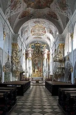 Die Kirche ist eine weiträumige Emporenhalle. Das Kirchenschiff besitzt ein Tonnengewölbe, die Stichkappen leiten mit Sichtschächten zu den Fenstern über. An drei Seiten befinden sich Arkadengänge. An der Nord- und Südseite sind die Pfeilerarkaden rundbogig, an der Westseite spitzbogig, ein Anklang an die Spätgotik. Im Erdgeschoß sind die Arkaden durch Zwischenmauern zu Kapellen geworden: Je vier an den Längswänden, drei an der westlichen Schmalseite. Pilaster unterteilen das Schiff in vier Joche, sie tragen ein vorkragendes Gesims, das die Wand vom Gewölbe trennt. Wände und Gewölbe tragen einen reichen, dichten Stuckdekor. Der dreijochige Chor ist langgestreckt, tonnengewölbt und besitzt einen halbrunden Schluss.