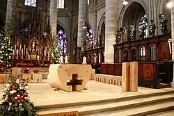 Als Grundstoff seiner meisten Arbeiten wählt Simon Bäume, die umgestürzt oder geschädigt sind. So schuf er zum Beispiel 2009 den neuen Volksaltar im Gmünder Münster aus einer 150 Jahre alten Roteiche. Der Altar als Ort der Eucharistie und der Ambo als Ort des Wort Gottes bilden bei diesem Entwurf eine Einheit, da der Ambo in Kreuzform, dem ausgesägten Kreuz des Altares entspricht. Nicht nur Altar und Ambo, sondern das gesamte Werk ist eine Einheit, da auch die Kredenz und die Sedilien vom gleichen Baum stammen.