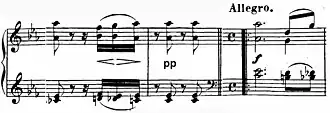 - ↑ Der Eindruck der Atemlosigkeit resultiert vor allem aus der aufsteigenden Seufzermotivkette in den Takten 9 und 10, die wegen des extrem schnellen Tempos nur atemlos aufgeregt wirken kann.