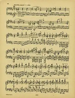 - Das triumphierende Fanfarenthema erscheint nach einer virtuosen kadenzartigen Überleitung mit gebrochenen Akkordsprüngen. Liszts Ausdrucksbezeichnung lautet Grandioso. Es steht hier in D-Dur, also der Durparallele zu h-Moll. Dieser Tonartverlauf ist gängige Praxis in Sonaten.
