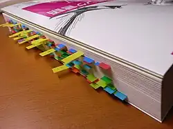 Ein Klebezettel, ein Haftzettel oder eine Haftnotiz, auch als Post-it[1] oder Haftie bekannt, ist ein kleiner Zettel, der an der Rückseite einen mit Haftklebstoff beschichteten Streifen besitzt, mit dem man ihn an einem anderen (glatten) Gegenstand festkleben, von dort rückstandsfrei wieder lösen und erneut festkleben kann.