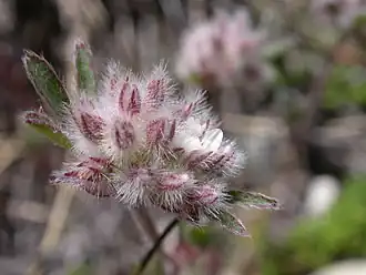 Detail der Blüte des Hasen-Klees (Trifolium arvense). Gut zu erkennen sind die federig angeordnete Behaarung, die die Verwehung der Früchte begünstigt.