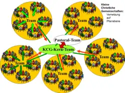- Kirche: Vernetzung mit der Pfarrei und damit mit der gesamten Kirche: durch konkrete Vernetzungsstrukturen (Beauftragungen, Treffen der KCG-Leiter mit der Pfarreileitung, Schulungen u. v. m.) ist die Kleine Christliche Gemeinschaft mit der Kirche verbunden