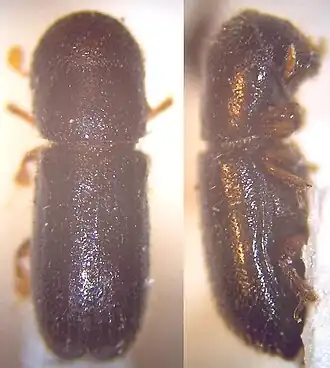 Die Käfer werden 1,5 bis 2,4 Millimeter lang und haben einen zylinderförmigen Körper. Der Halsschild ist stark abgeflacht, bucklig gewölbt, länger als breit, vorn abgerundet, zylindrisch, mit konischer Wölbung vor der Mitte und verdeckt von oben gesehen den Kopf. Der Vorderrand ist glatt und ohne Höckerkranz. Es ist erst hinter dem Vorderrand gekörnt. Die Flügeldecken sind weit herabgezogen, die Hinterflügel nur rudimentär vorhanden, daher ist der Käfer flugunfähig. Die Vorderhüften liegen weit auseinander. Das Abdomen bleibt ab dem zweiten Sternit zum Ende hin gerade. Das dritte Tarsenglied ist zylindrisch geformt. Die Fühlerkeulen sind breit, die Fühlergeißel ist fünfgliedrig.