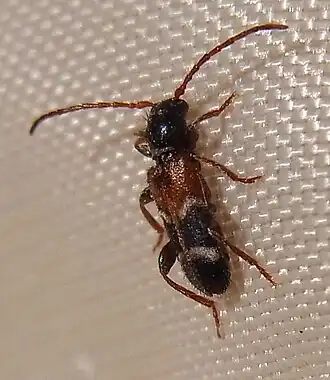Die Flügeldecken sind sehr fein punktiert und flach. Auf den Flügeldecken sitzt hinter dem Schildchen an der Naht ein Haarbüschel (Abb. 4). Im ersten Drittel sind die Flügeldecken rotbraun, hinten dunkel. In Südeuropa findet man häufig Formen, bei denen die gesamten Flügeldecken und auch die Fühler dunkel sind (Abb. 2). Gewöhnlich werden die Flügeldecken durch zwei weiße Querbinden etwa gedrittelt. Die Querbinden können auch in Flecken aufgelöst oder verbreitert und ineinanderlaufend ausgebildet sein. Gewöhnlich sind beide geschwungen, das vordere stärker. Das hintere verläuft schräg, außen nach hinten.