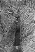 | Wp 1/46 | „Im Gräberfeld“ | Zwischen 5 m und 24 m hinter dem Limes kaum wahrnehmbare Spuren der Turmstellen eines Steinturms[19] und eines älteren Holzturms[20] innerhalb des hallstattlichen Gräberfeldes, das in diesem Bereich vom Pfahlgraben durchschnitten wird. Die römischen Befunde waren bereits zur Zeit der Reichs-Limeskommission so stark gestört, dass keine exakten Maße dokumentiert werden konnten. |