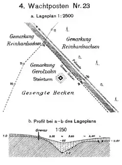 | Wp 7/31 | „Steinernes Haus“ | ![]() Der damals große Schutthügel von Wp 7/31[50] war bereits dem Archäologen Eduard Paulus (1837–1907) bekannt und wurde von Conrady 1879 und 1880 erstmals untersucht. Wie der Name des Waldbezirks Steinernes Haus bezeugt, war das Wissen um einen alten Siedlungsplatz nie ganz verloren gegangen. Die Ruine war damals auch als Hönehaus (sprachetymologisch von Hüne) und durch die Sage vom Riesenfräulein bekannt. Über dem regelmäßig angelegten Fundament aus schräg gestellten Steinen hatten sich die 0,75 bis 0,85 Meter breiten Mauern eines rechteckigen Gebäudes erhalten. Tiefgreifendere Untersuchungen fanden zur Zeit der RLK nicht statt.[48] Es wurde jedoch erkannt, dass der eigentliche Wachturm noch nicht gefunden worden war.[51] Erst im Oktober 1969 erfolgte eine durch das Staatliche Forstamt Walldürn geleitete vollständige Freilegung und auf drei Lagen aufgemauerte Konservierung der Fundstelle. Dabei konnte neben dem vermutlich einstöckigen[52] Nebengebäude[53] auch das knapp 6 Meter weiter südlich gelegene, rechteckige Steinturmfundament ermittelt werden. Das Bauwerk mit seinen rund 0,80 Meter breiten Mauern besaß eine Größe von 4,70 Metern (NO und SW) × 4,50 Metern (NW und SO) und war in Zweischalentechnik errichtet worden. Der Graben des Turmes wurde mit zwei Schnitten so erfasst, dass es zu keiner Klärung kommen konnte, ob dieser Graben rund oder rechteckig gewesen ist. An den beiden untersuchten Stellen war der Graben 1,80 beziehungsweise 2 Meter breit und von der Grabenspitze bis zur Turmmauer 2,5 und 3,2 Meter entfernt. An der Innenseite der Nordostwand des Nebengebäudes konnte ein offensichtlich nachträglich eingebauter Mauerwinkel festgestellt werden. Die beiden Flanken (NO- und SW-Seite) des Bauwerks waren 8,10 Meter lang, die Schmalseiten wurden mit 6,50 (NW) und 6,80 (SO) Metern eingemessen. Durch zwei Suchschnitte ließ sich der V-förmige Graben der Limespalisade in einer Entfernung von rund 17,50 Metern (Grabensohle) zur Turmstelle ermitteln. Er war an diesem Punkt noch 0,70 Meter breit. Als verwendete Holzart für die Palisade konnte aus den erhaltenen verkohlten Hölzern mit einiger Sicherheit Rotbuche bestimmt werden. Für eine Altersbestimmung waren die Proben jedoch nicht geeignet.[54] |