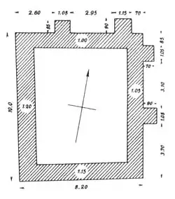Die Aufmessungen der Kommission zeigten ein quadratisches Kastell von außen 29,60 Meter und innen 23,20 Meter Länge. Cohausen hatte demgegenüber mit den von ihm gemessenen Seitenlängen 24,20 Meter, 27,70 Meter, 24,70 Meter und 24,50 Meter die Form eines unregelmäßigen, wohl ursprünglich ein Quadrat anstrebenden Vierecks ermittelt, dessen Nordecke aus dem theoretischen Quadrat um etwa zwei Meter heraussprang. Die Wehrmauer war als Trockenmauerwerk ausgeführt, ihre Mächtigkeit lag zwischen 2,90 und 3,15 Metern. Sie war als Füll- oder Schalenmauerwerk konstruiert, dessen Außenseiten aus behauenen, 15 × 30 Zentimeter großen Grauwackesteinen sorgfältig gearbeitet waren. Der Bereich zwischen den Schalen war mit kleinen Steinen und Schotter aufgefüllt. Vor der Mauer befand sich eine 0,80 bis 0,90 Meter breite, mit Letten und Geröll verfestigte Berme. An die Berme schloss sich ein 3,70 Meter breiter und 1,20 Meter tiefer Spitzgraben an. An der Nordseite des Kastells befand sich das einzige Tor der Anlage. Es lag nicht mittig, sondern war um etwa zwei Meter nach Westen verschoben. Vor dem Tor setzte der Graben aus, die Durchfahrtsbreite betrug ungefähr 3,30 Meter.