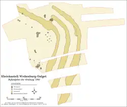 Die Grabensohle selbst war mit dem sterilen Schutt kleiner Plattenkalkfragmente verfüllt, die offenbar bereits kurz nach dem Aushub von den Wänden des Grabens auf dessen Grund fielen. An einer gut erhaltenen Stelle konnten im inneren Graben vier Verfüllungshorizonte dokumentiert werden, wobei die Trennung aufgrund der geringen Unterschiede schwierig war.[8]