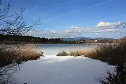 | Kleinsee, unten rechts das Westufer des Klopeiner Sees, im Hintergrund die Drau | ||