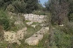 Die Agora von Kleonai lokalisierte man südlich in der Unterstadt nur etwa 100 m nördlich der Stadtmauer. Bereits 1881 fand Johannes Schmidt hier ein Block einer Exedra[24] der die argivischen Bildhauer Xenophilos und Straton nennt, die Ende des 2. und Anfang des 1. Jahrhunderts v. Chr. wirkten.[25] Es wurde bis heute sechs Exedrensteine, die zu drei verschiedenen Exedren gehörten, aufgefunden.