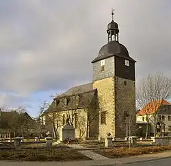 - Die Kirche St. Georg im Ort beging 1998 ihre 275-Jahr-Feier, was auf eine Ersterwähnung im Jahre 1723 hinweist, obwohl der Turm wahrscheinlich wesentlich älter ist. Sie wurde vermutlich dem Heiligen Georg geweiht. 2008 erhielt sie die Orgel der evangelischen Kirche von Bad Berka, finanziert durch Überschüsse der Thüringer Staatslotterie. Die Reparatur der alten Orgel wäre für die Gemeinde zu teuer geworden.[9]