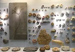 In Beggingen entdeckte 1962 ein Schüler einen Wirbelknochen eines Ichthyosauriers aus dem Schwarzjura mit zwölf Zentimetern Durchmesser. Die folgenden Grabungen ergaben ein Schwanzstück von ca. 1,20 m länge. Beim Bau der A 98 fand man 1991 ein kleines Kieferstück mit drei Placoduszähnen.[8] Gefunden werden jedoch vor allem häufig vorkommende Fossilien, angefangen von Seelilien des Muschelkalks, Ammoniten, Muscheln, Schnecken und Brachiopoden des Jura, Belemniten aus dem Schwarzjura bis hin zu Haifischzähnen des Miozän.