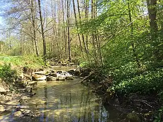 - (Linker Quellast des vorigen), von links und Süden auf etwa 665 m ü. NHN östlich des Häufelsbergs schon im Steinhofener Wald, 0,7 km und ca. 0,6 km².[9] Entsteht auf etwa 775 m ü. NHN im Bisinger Wald unterm Hundsrücken (931,1 m ü. NHN), der nach Norden im Häufelsberg tiefer ausläuft. Quellast mit dem größeren Einzugsgebiet.