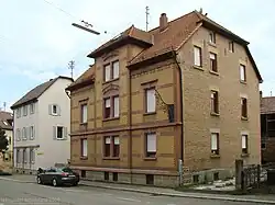 Das Wohnhaus ist ein traufständiger zweistöckiger Bau, der nach oben mit einem Krüppelwalmdach abschließt. Die zur Straße gerichtete Fassade wird durch einen dreistöckigen Mittelrisalit gegliedert. Das gesamte Gebäude ist, wie viele andere in dem Ortsteil, in dekorativem Sichtmauerwerk aus Ziegeln der ehemaligen Ziegelei Böckingen ausgeführt. Horizontal und an den Kanten betonen farbig glasierte Ziegel das einheitliche Erscheinungsbild.