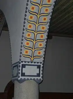 Die Seitenwände sind weiß verputzt, die Holzelemente in hellem Ockergelb gestrichen. Die Fensterlaibungen und die Scheidbögen der Säulen zwischen den beiden Kirchenschiffen sind ebenfalls farbig gestrichen.