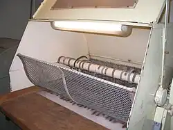 Pelzklopfmaschine mit Läutertonne (Baujahr ca. 1971): Im oberen Teil werden die Pelze geklopft. Das Handrad dient zum Regulieren der Klopfstärke. Hinter der Maschine der Staubauffangbeutel. Im unteren Teil befindet sich die beheizbare Läutertonne zur Pelzreinigung. Die Läuterzeit ist einstellbar. -