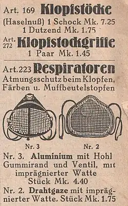 - „Ideal“ der Firma J. Kulp, München. Riemen-Handklopfmaschinen; Stücken-Klopfapparat; Bürstenwalze, „beste und billigste aller Klopfmaschinen“ (Eigenwerbung). Angeboten auf der Neuheiten-Ausstellung, Leipziger Ostermesse 15. April – 6. Mai 1928. Auch zu besichtigen bei Philipp Manes, Berlin.[43]
