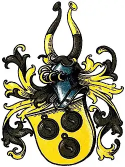 Blasonierung: In Gold drei (2:1) schwarze Schellen. Auf dem Helm schwarz-gold übereck-geteilte Büffelhörner. Die Helmdecken sind schwarz-golden.[13]