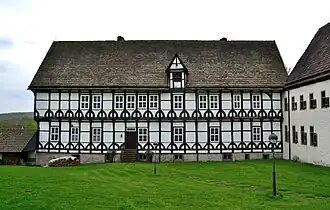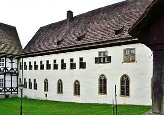 - Von den Klausurgebäuden ist das zweigeschossige Dormitorium von 1509, das als ältester Fachwerkbau in Lippe gilt, zu nennen, welches ein typisch spätmittelalterliches Fachwerkgefüge zeigt. Es dient als Pfarrhaus. Auch der Kapitelsaal ist erhalten.