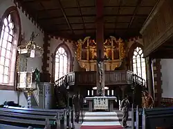 Das Kirchenschiff, das im Laufe von 200 Jahren baufällig geworden war, musste 1566 einem Neubau weichen. Die Turmhalle, deren Erneuerung bereits im 15. Jahrhundert begonnen hatte, erhielt ein zweijochiges Rippengewölbe, das ohne Kapitelle aus mehrseitigen Wandpfeilern strebt. Einer der beiden Schlusssteine trägt noch schwach erkennbar das Wappen des Mainzer Erzbistums mit der üblichen Anordnung der Mainzer Räder, der andere, nur als Fragment erhaltene, vermutlich das Wappen des Erzbischofs Dietrich Schenk von Erbach mit den Erbacher Sternen. 1453 wurde der Turm um eine Klangarkade in Form von schmalen Mauerdurchlässen mit Rundbögen erweitert.